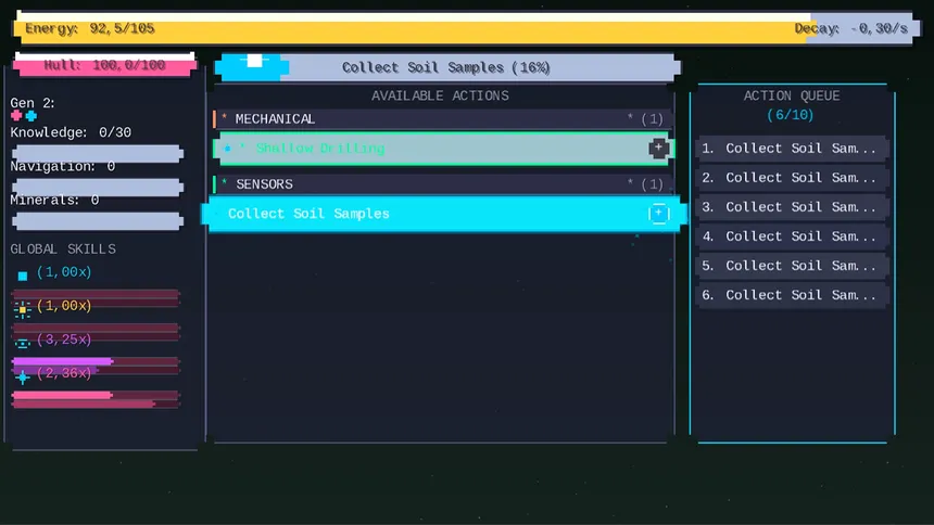 An incremental space survival game where you manage a Von Neumann probe across 7 distinct phases. Master actions to reduce time, automate tasks, and build a fleet. Each death makes you stronger. Deterministic gameplay, offline progress, no manipulative mechanics.