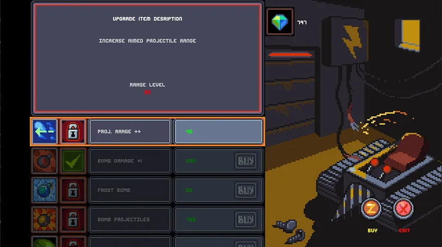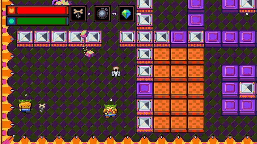 Pug Trouble is a fast-paced, bite-sized action game with light roguelike elements, featuring 5 compact levels that are partly randomly generated for replayability. Blast through destructible blocks, collect valuable gems, and fight your way toward the exit while taking down enemies along the way.