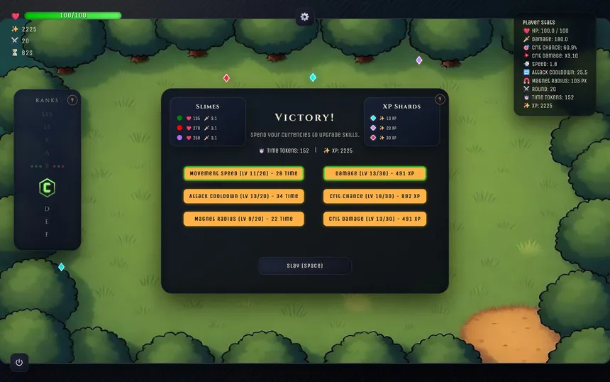 A cozy top-down arena survivor where you clear waves of slimes, upgrade your skills between rounds, and climb a rank ladder at your own pace. Relaxed, replayable combat with steady progression and an endless mode.