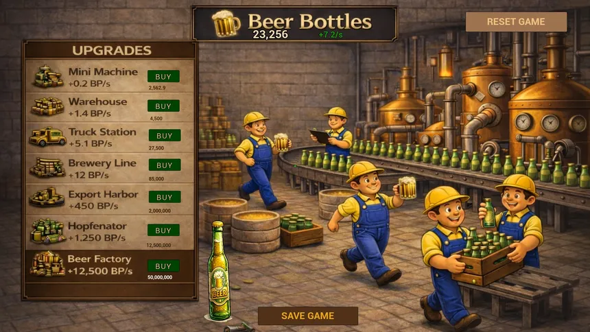 Beer Clicker is a casual idle clicker game where you brew beer, earn bottles, and expand your brewery. Click to produce, unlock upgrades, automate systems, and enjoy satisfying progression at your own pace.