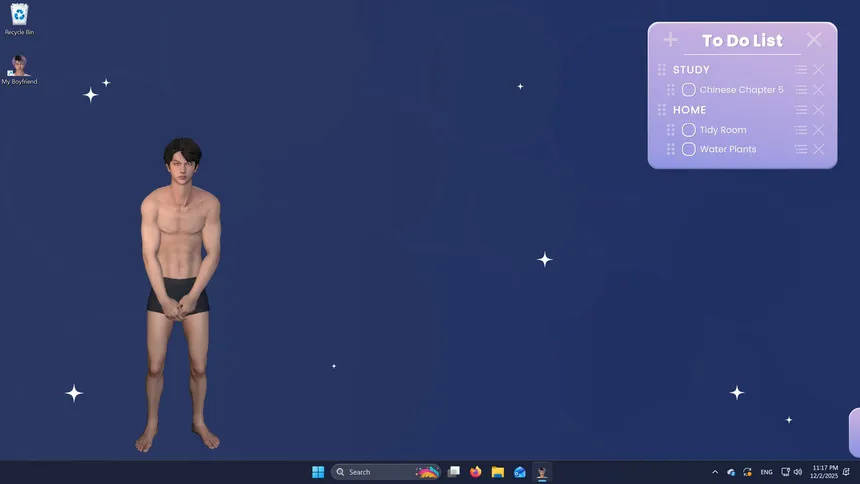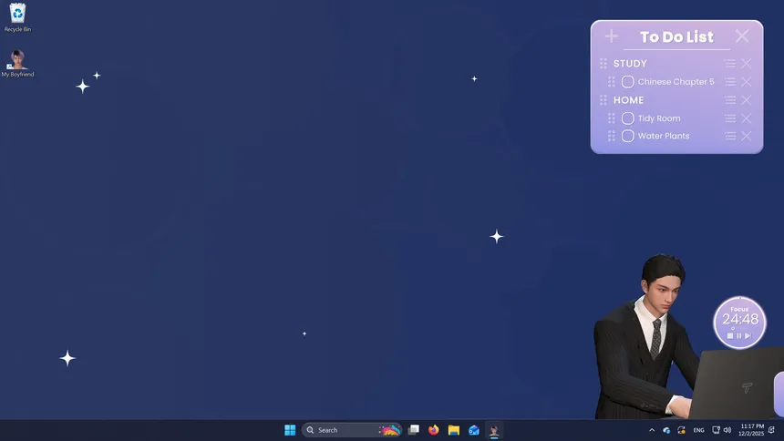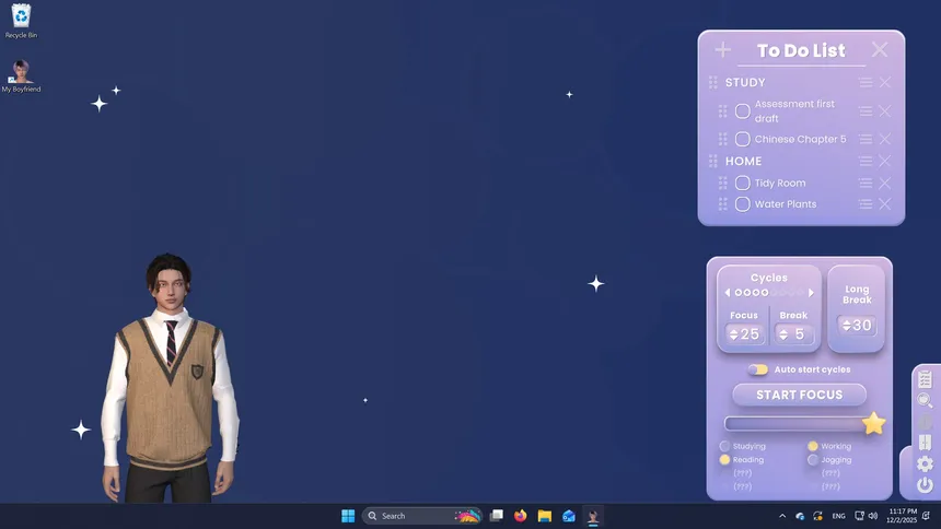 My Boyfriend — твой очаровательный спутник на экране для работы или учебы. Он отражает твою концентрацию, помогает организовать цели и празднует твой прогресс, превращая даже самые загруженные дни в тёплые, мягкие и наполненные заботой. Оставайся продуктивным с кем-то рядом.