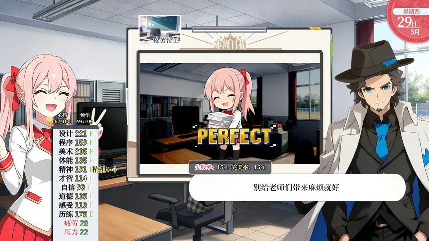 《闪耀!我的游戏班》是一款以学校生活和游戏开发为主题的多结局模拟养成游戏。你作为一名负责学校游戏班的老师,将带领唯一的一名学生,在三年时间内以将其培养为最优秀的游戏专业学生为目标,做出最好的游戏打败其他学校夺得大奖,拯救学校重返巅峰。神秘程序带来行业危机,而你和你的学生将会拯救这个行业,还是加剧它的毁灭?三年后,这名学生随着毕业,又将拥有怎样的未来?这一切,都将由你亲手决定。