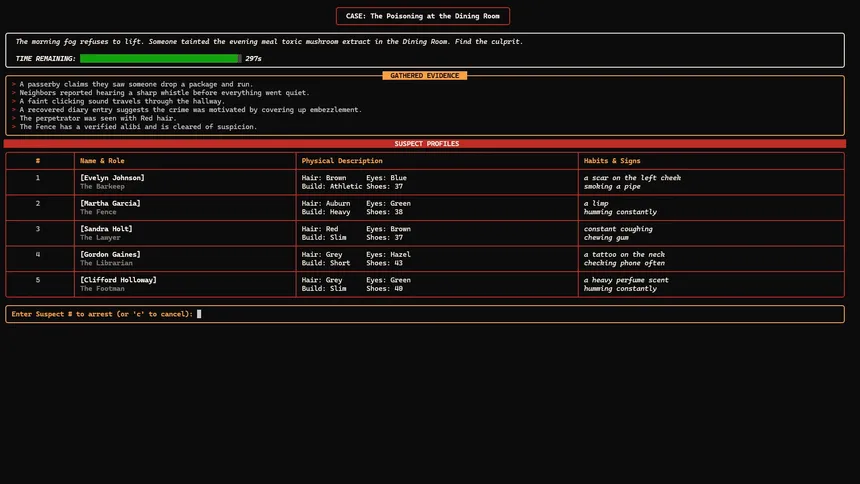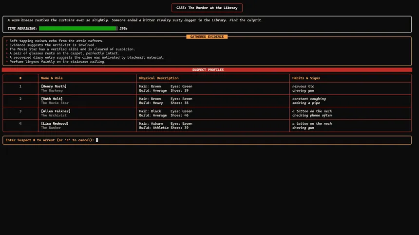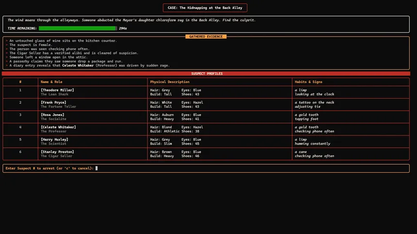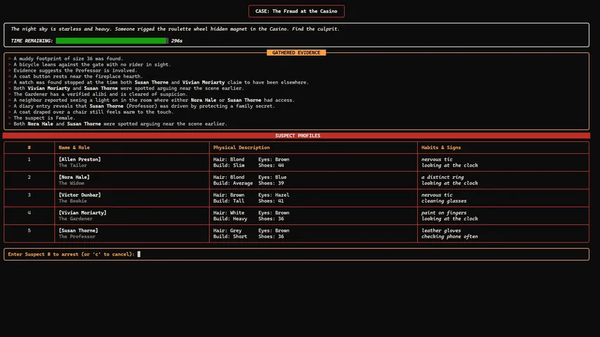 Pour a coffee, light a match, and crack the case. Micro Mystery Investigator offers infinite procedural logic puzzles in a stylish noir setting. Sift through clues, cross-reference alibis, and deduce the culprit before the trail goes cold. Pure deduction, zero guessing.