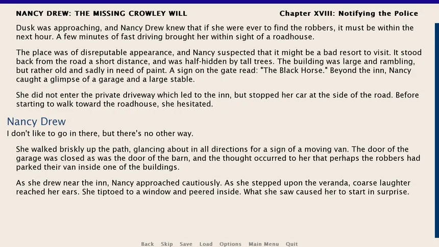 "Nancy Drew: The Missing Crowley Will" is a text-based mystery adventure set in the year 1930, where Nancy Drew locates a lost will. Make choices, solve puzzles, and guide Nancy through her very first case.