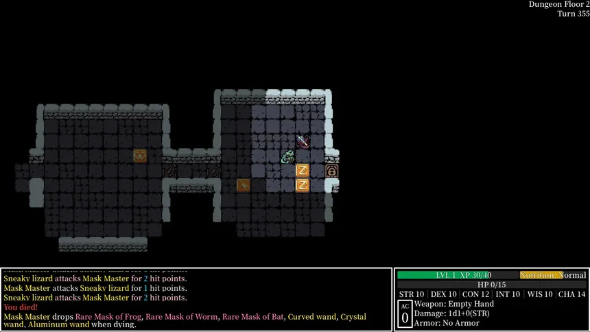 A classic turn-based roguelike dungeon crawler with D20 dice combat. Three unique classes — a soul-projecting Cultivator, a monster-recruiting Mask Master, and a shadow-stalking Rogue. 117 monsters, randomized identification, and procedural dungeons make every run a new adventure.