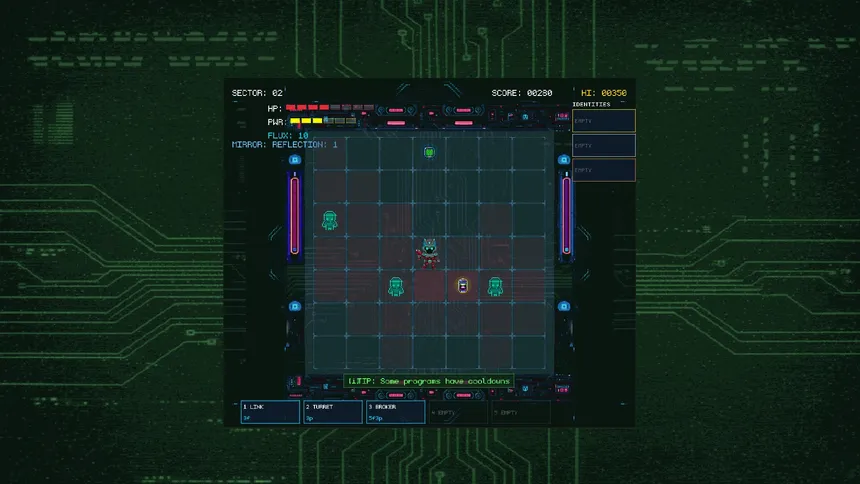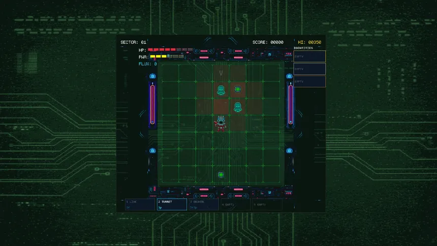 Position yourself on a 7x7 grid, absorb enemies to fuel your abilities, and climb through 12+ increasingly hostile sectors to reach the core.