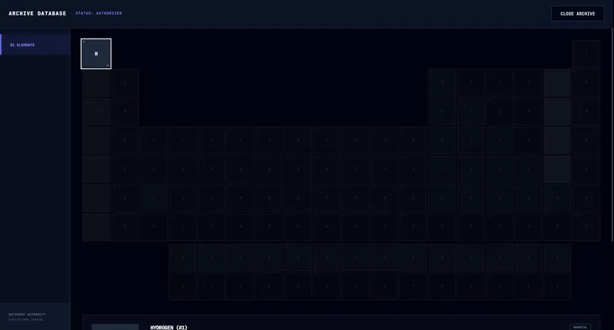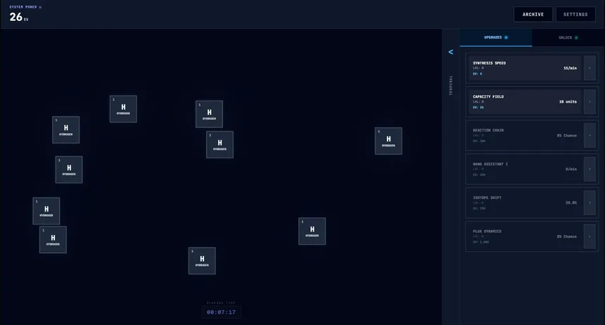 A game about collecting, upgrading, and discovery, using the periodic table as a basis. Start with gathering Hydrogen and use the Atomic Synthesizer's automatic conversion system to generate energy and use it to stabilize the machine back to working at a 100% efficiency.