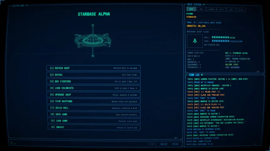 Trade, fight, and explore a procedurally generated galaxy in this deep space trading game inspired by 80's sci-fi computer screens and Trade Wars 2002. Command fleets, negotiate with alien factions, colonize planets, and forge your legacy across five unique career paths.