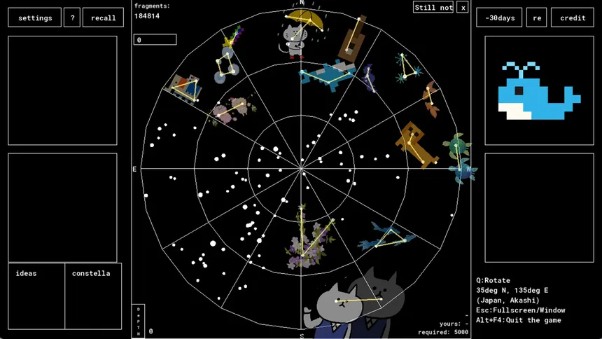 「Your Own Constella」 is a relaxing game where you create your very own constellations in a real night sky. Using a star map based on real-world time and location, you can freely edit and place your favorite images—or choose from roughly 270 illustrations—as constellations.