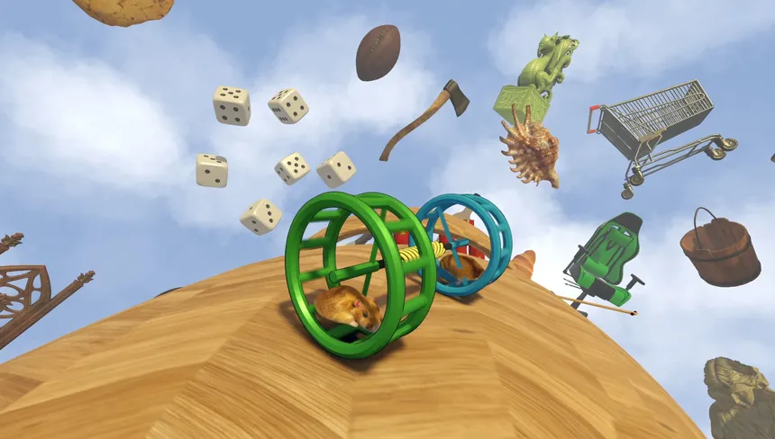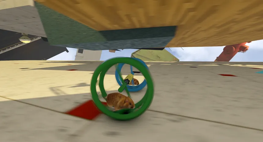 Hamsteria — сложная кооперативная игра для двух игроков, где вы управляете двумя хомяками в соединенных колесах. Поддерживаются онлайн-кооператив, локальный кооператив и одиночная игра!