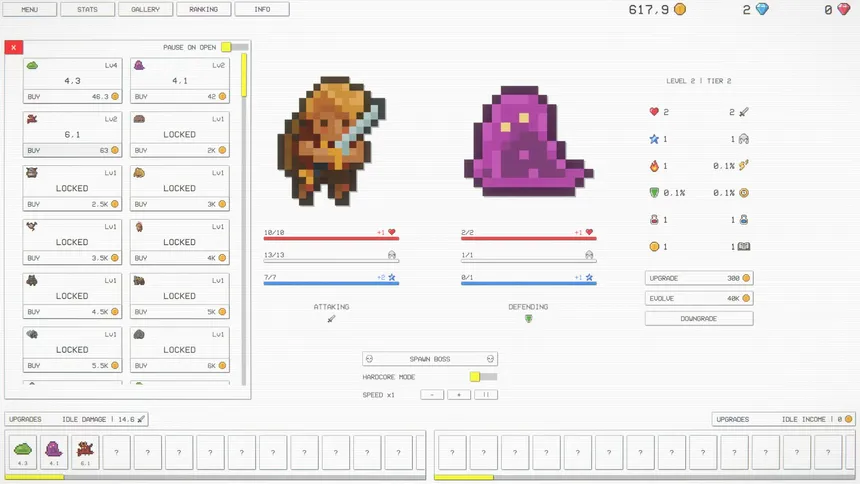 Сражайтесь с полчищами врагов и могущественными боссами, освойте двойную прокачку и нанимайте помощников для генерации урона или золота. Открывайте уникальные перки и испытайте хардкор-режим. Усиливайте врагов ради бонусов — но поражение будет стоить дорого. Рискни всем. Стань чемпионом.