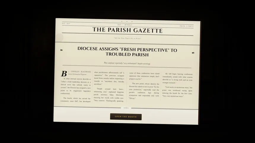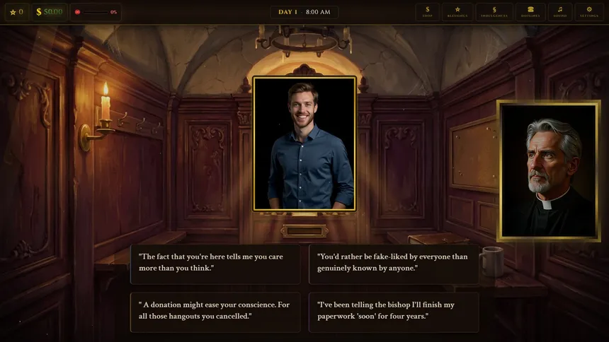 Hear sins. Judge souls. Upgrade your booth. Play as a priest hearing increasingly absurd confessions in this darkly comedic simulator. Will you guide your flock to salvation... or squeeze them for donations to install a hot tub in your confessional?