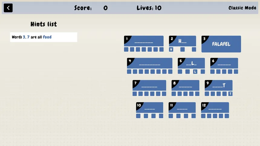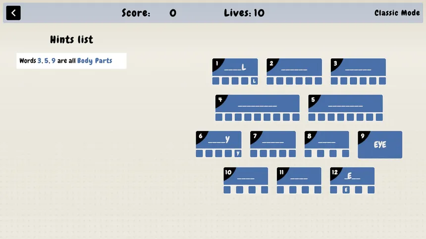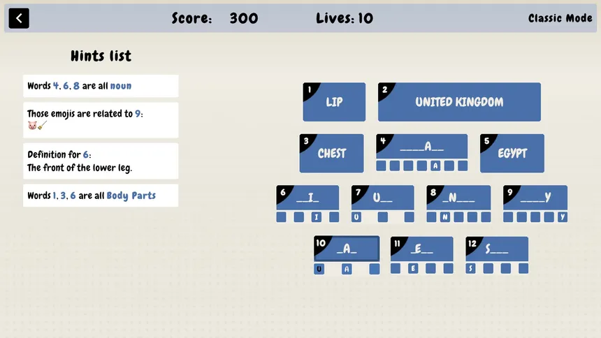 Guess hidden words using clever hints about categories, definitions, rhymes, and more. Play solo in Classic or Survival mode, or compete with friends in local VS battles, featuring 10,000+ words.