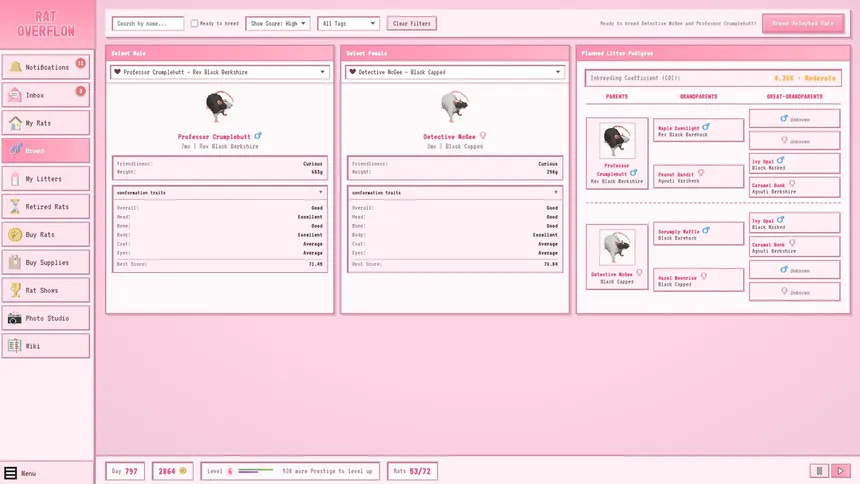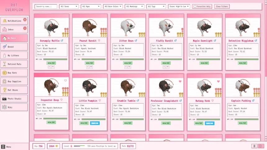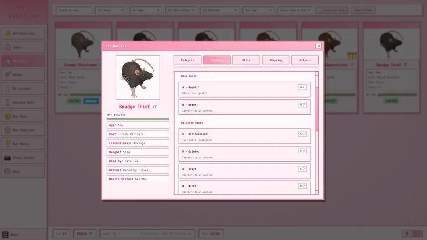 Rat Overflow is an adorable rat breeding simulator about genetics, glory, and having way too many rats. Develop your show winner bloodlines and breed thousands of unique rat coats!