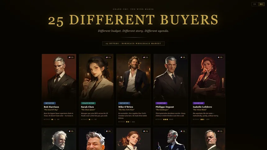 Master the art of Bordeaux. Navigate volatile weather RNG and out-negotiate 25 unique buyers with your own pricing strategy. From terroir scoring to Michelin-star contracts, every vintage is a high-stakes calculation. A deep, data-driven simulation for those who take wine—and management—seriously.