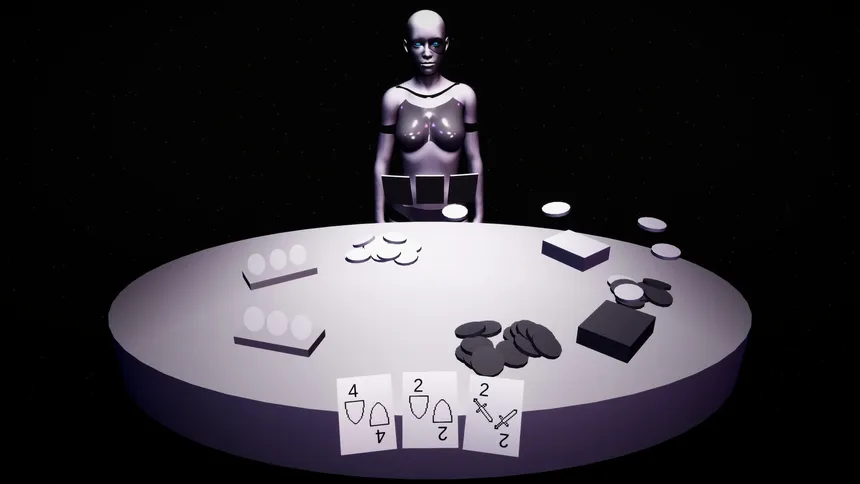 Покероподобная карточная дуэль против адаптивного ИИ в киберпанковском сеттинге. Делайте ставки, выбирайте программы атаки и защиты, управляйте уровнем напряжения и активируйте особые карты через ретро-мини-игры, чтобы переписать правила раунда и переиграть алгоритм.