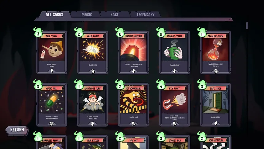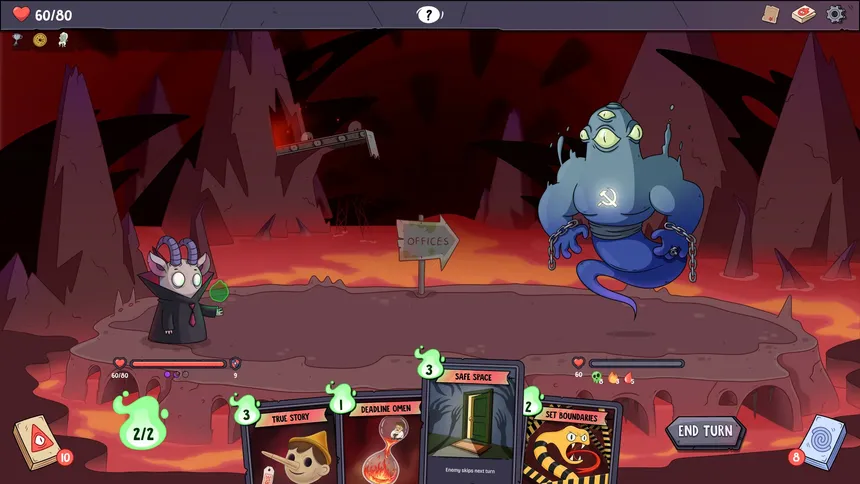 A fast, chaotic roguelike deckbuilder set in the absurd Hell’s Office. Build a powerful deck, collect twisted artifacts, and outplay your demonic coworkers as you claw your way up the corporate ladder. Face bizarre encounters, slay vicious foes, and crush your boss to finally save your soul.