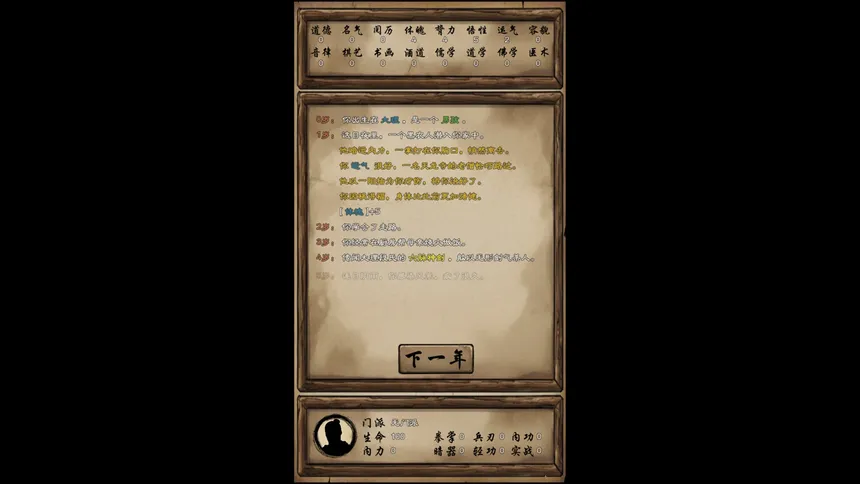 一款文字类武侠人生模拟器游戏,你将扮演一名江湖中人,经历从出生到死亡的完整一生。体验多样身份,通过成长、游历、修炼、应对各种选择和战斗。改变自己的人生,同时也能影响他人的命运、左右门派的兴衰。