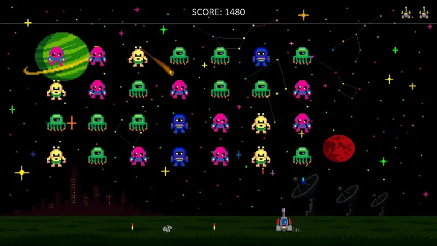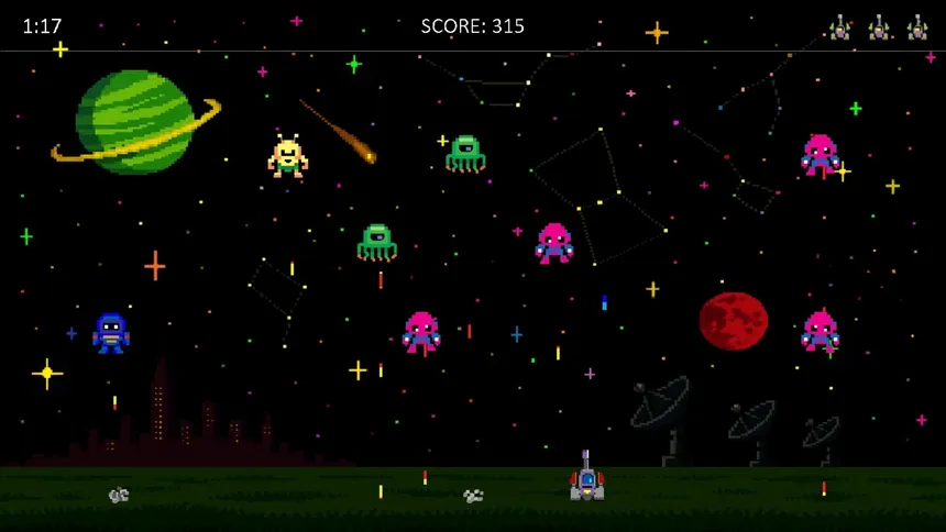 Alien attackers from the Izar system are invading Earth! Battle the extraterrestrial menace in endless waves in this tribute to classic alien 'invader' shooters from the late '70s and early '80s. Aim for the high score by destroying the evil alien monsters!