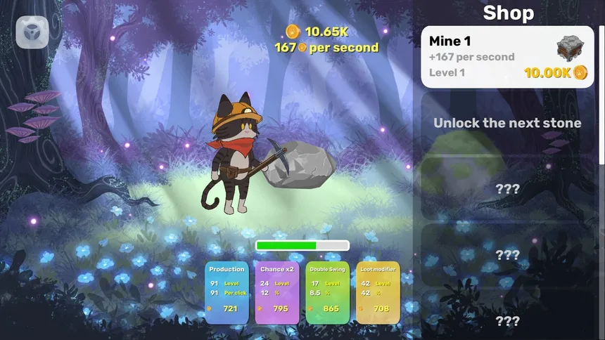 Погрузись в очаровательный мир кликера с милым котом-шахтёром! Разбивай камни, добывай золото, открывай новые кирки и бесконечные глубины!