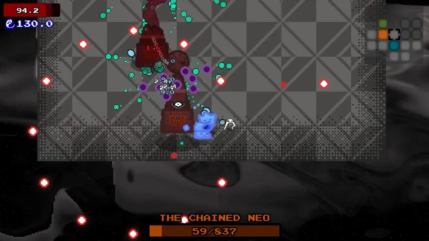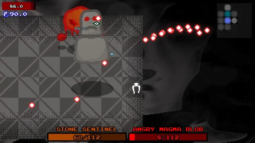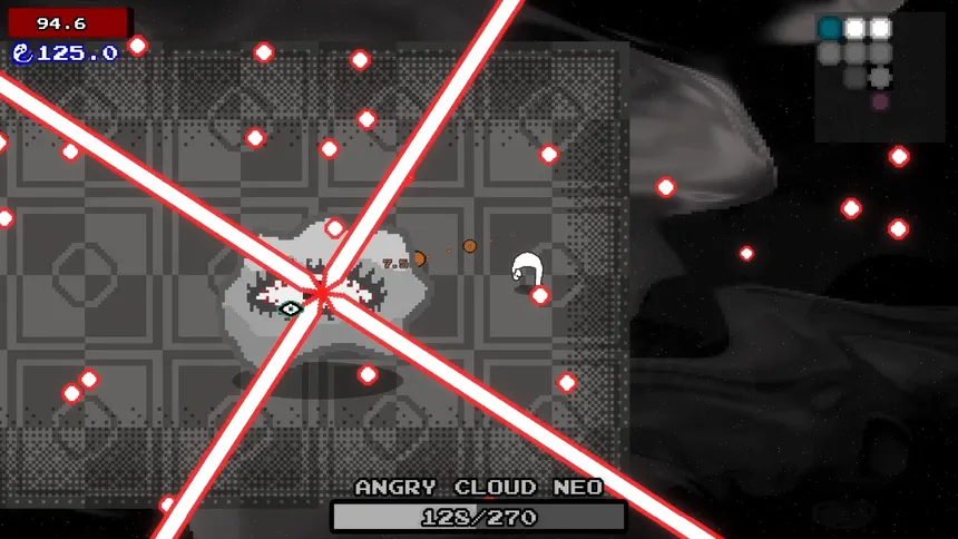 In this game you play as the little fellow we know as CRO, navigate through the void while collecting cool upgrades, synergies and fighting unique bosses along the way. Every room you enter will contain a different boss each with their own bullet hell patterns.