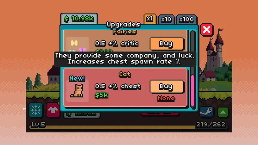 A tiny clicker game that sits on the corner of your screen. Kill monsters, earn gold and buy upgrades to level up (even when you're idle). Unlock cosmetics to customize your character. Watch the numbers increase non-stop and become a powerful witch!