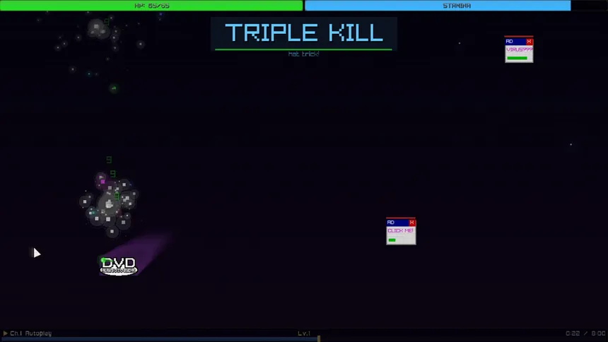 Delete thousands of digital pests and live to the last bounce. You’re the DVD logo in a short ultra-retro, chaotic and crazy bullet-hell survivors-like: bounce, collect Bytes, evolve weapons, and melt pop-ups, Clippy, and internet garbage. Hit the corner, break the run, and beat your highest scores!
