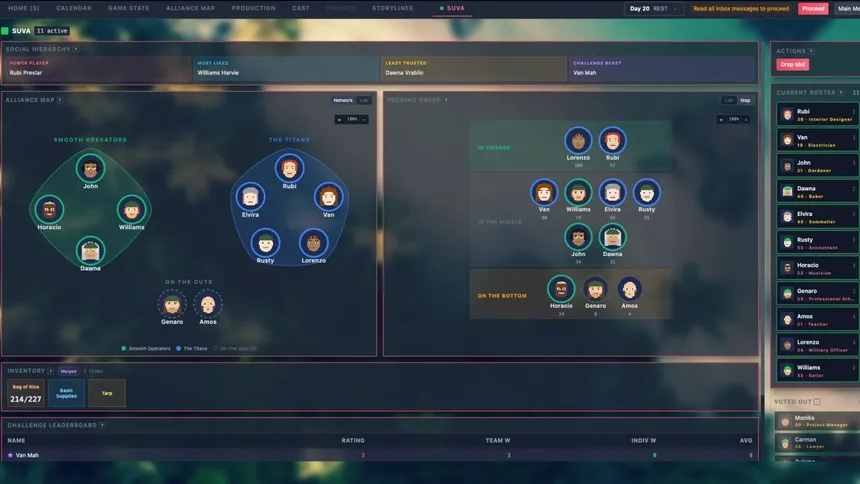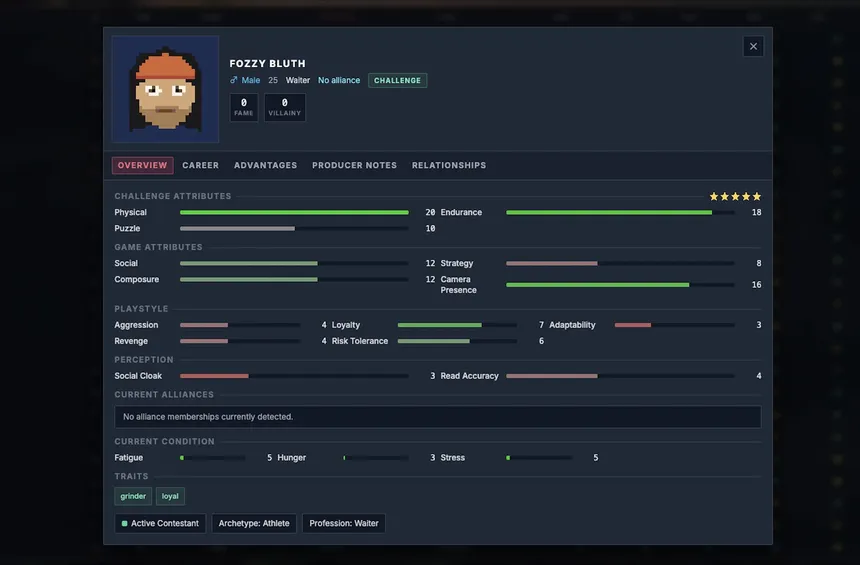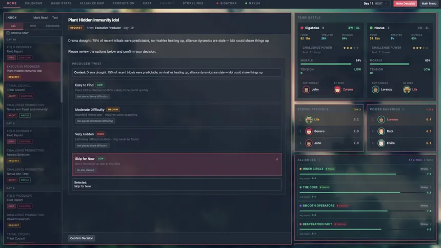 A reality TV production management game. Cast, create or download contestants, design your season, and watch drama unfold in the most complex relationship sim ever created. Scout hidden talent, manage moods, watch challenges play out, and survive dramatic tribal councils. Build your franchise.