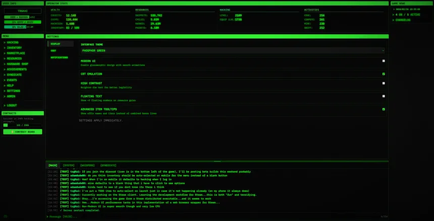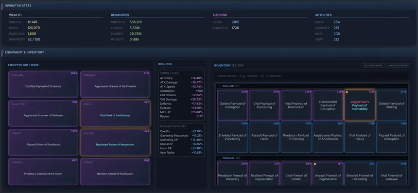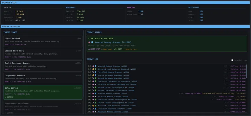 A persistent idle MMORPG, with a text-based hacking theme. Enjoy the "Inaction RPG" design philosophy by crafting equpiment using ARPG influenced prefix/suffix systems, build or join player managed syndicates, trade on the marketplace, and compete in community events.
