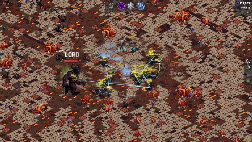 Descend into pixelated hell, smashing pentagrams and slaughtering demons for orbs. Spend them on persistent upgrades between runs. Reach level 250 to Prestige and grow exponentially stronger in this fast-paced action roguelite.