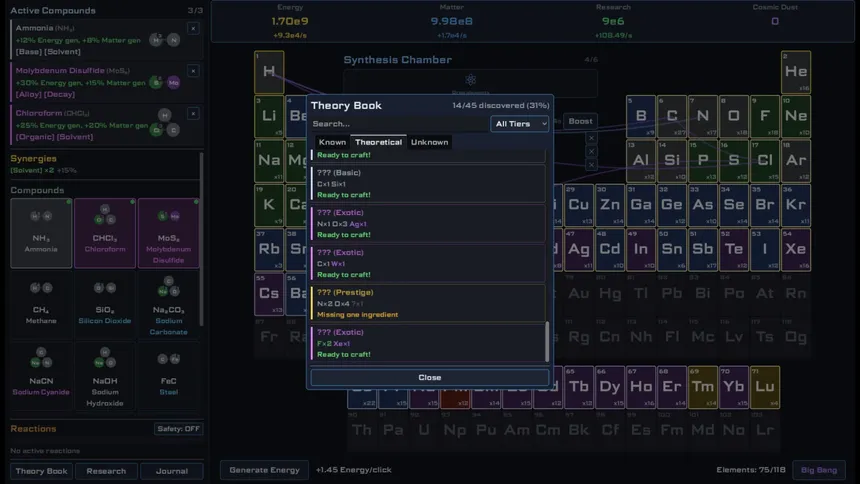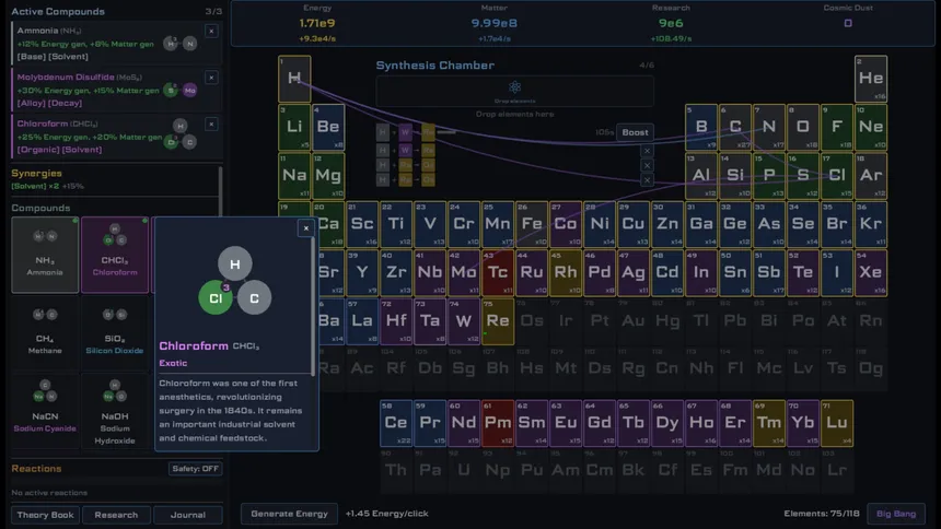 Build your atomic empire. Fuse elements, craft real compounds, trigger chain reactions, and break the periodic table wide open in an idle game where chemistry IS the strategy.