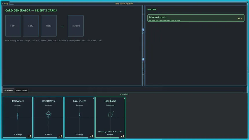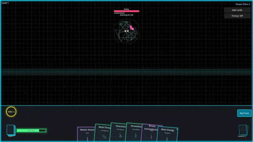A roguelike deckbuilder set in a glitching network where you build and upgrade your deck, fight enemies that telegraph their moves, and push through endlessly scaling difficulty with no run limit