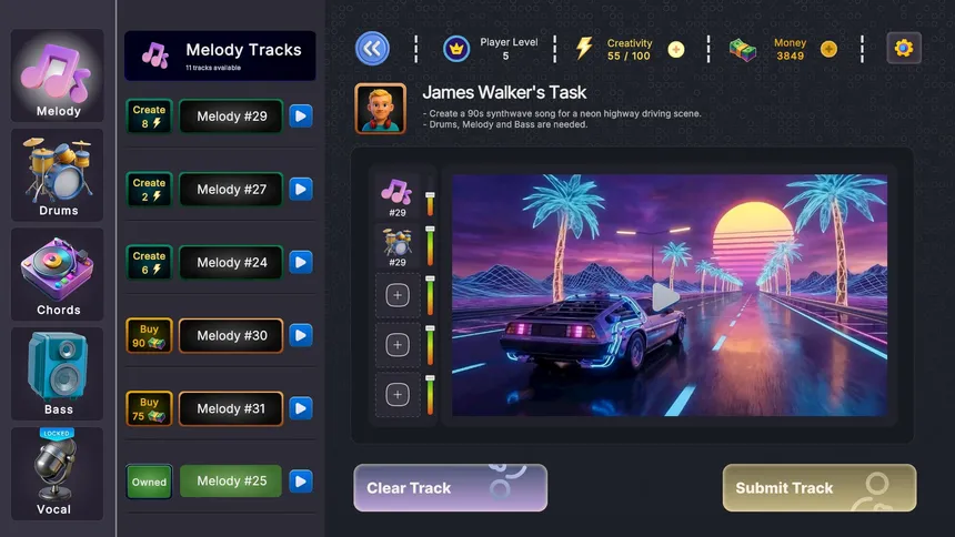 Креативный симулятор музыкального продакшена, где каждое сообщение это новый вызов. Создавайте музыку из видеозапросов с помощью собранных лупов, исследуйте разные жанры, развивайтесь в Консерватории и соревнуйтесь онлайн, используя мощные студийные инструменты и эффекты.