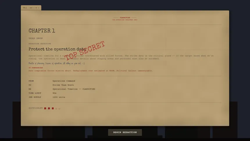 You're a government officer. Documents hit your desk, you scrub out the secrets, and you hope nothing leaks. Miss a word? Maybe it's fine. Miss a few? Well, ██████████. You've got limited ink, limited time, and frankly, limited ████████████. Cheaper than a ████████████.
