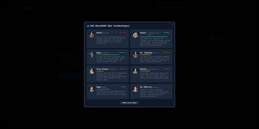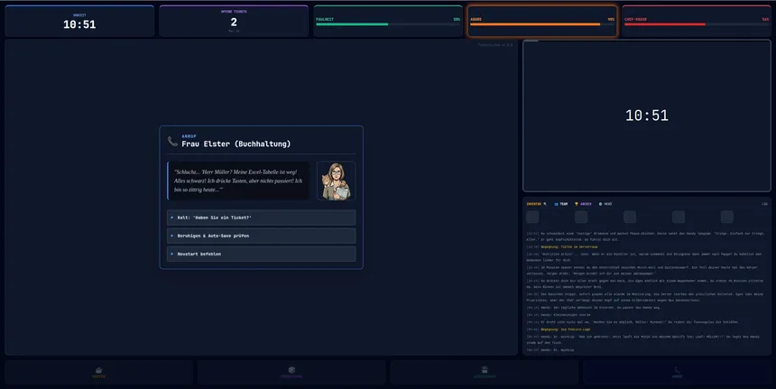 Willkommen in der IT-Hölle! Überlebe den Büro-Wahnsinn in diesem textbasierten SysAdmin-Simulator. Kämpfe gegen absurde Tickets, sammle Loot und senke deinen Puls mit Kaffee. Halte Chef-Radar und Aggro niedrig, um bis 16:30 Uhr deinen Job zu behalten – ohne den Monitor aus dem Fenster zu werfen.