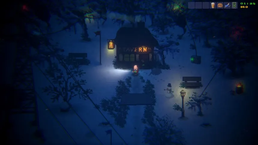 Take control of an old local regular who’s had a few too many in this little atmospheric pixel-art adventure. After being kicked out of the tavern into a biting winter blizzard, you must navigate the freezing, snow-covered streets to find your way home.