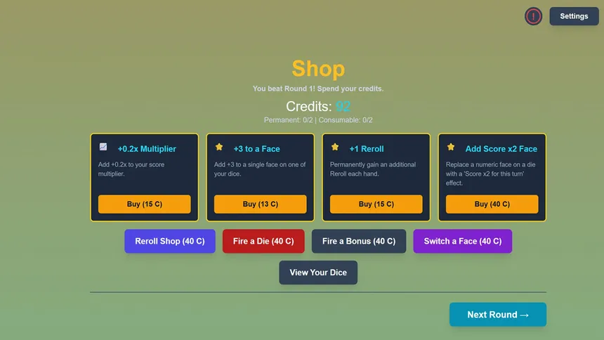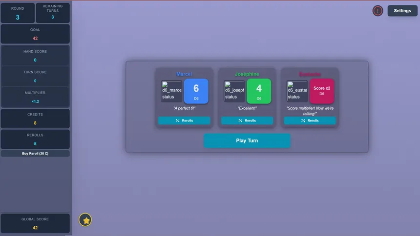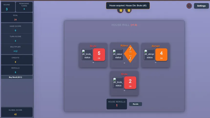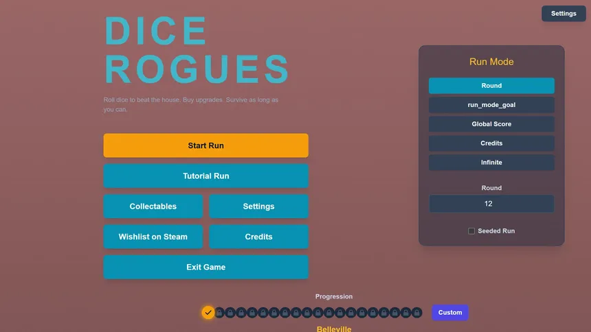 Dice Rogues is a tactical roguelite with infinite possibilities where you upgrade your dice and harness unpredictable rogue faces (X2, baguette, croissant, etc.) to bend fate, outplay the House, and survive a new roll each run.