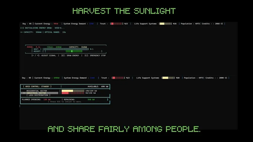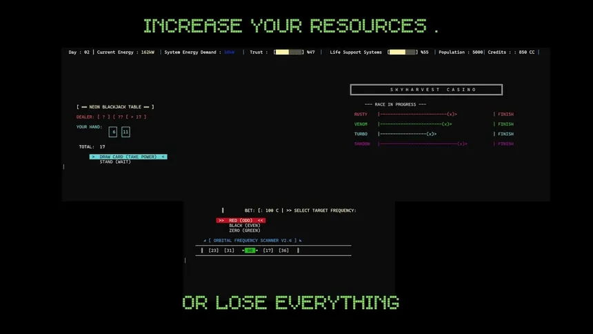 The Earth is dead. Take control of the ARC-7 terminal and manage the fate of 5,000 souls. Balance energy and credits, make moral choices, gamble, and survive the Loan Shark. Every keystroke has a price in this 100-day dystopian text-based simulation. Your shift begins now, Operator.