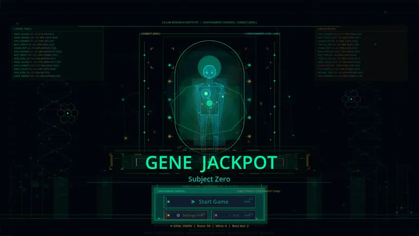 Gene Jackpot — игра от компании Yes Games, разработанная для платформы PC. Проект совмещает в себе такие жанры и элементы, как карточная. Дополнительно игроки выделяют такие особенности игры, как карточный баттлер, стратегия, пошаговая тактика и упрощённый рогалик. Игра рассчитана на одиночное прохождение, многопользовательские режимы не предусмотрены.