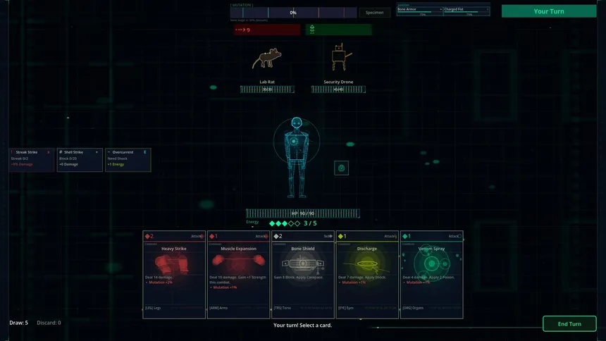 A roguelike deckbuilder where you gamble with your own genes. Every card played mutates your body. Every defeat triggers unpredictable mutations. Become a different monster every run. Losing has never been this fun.