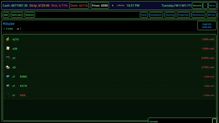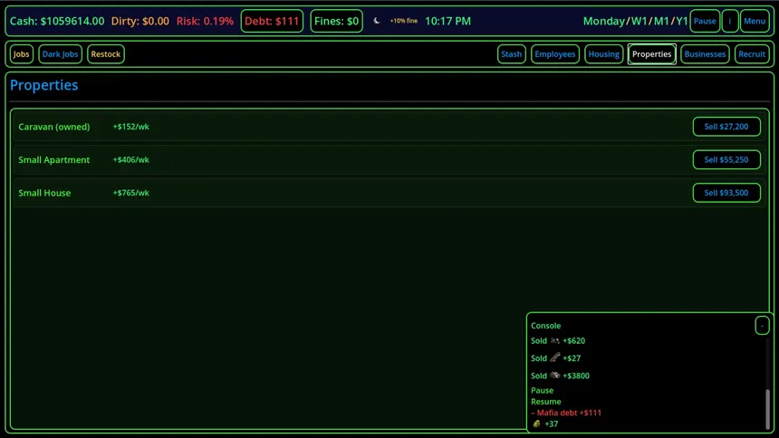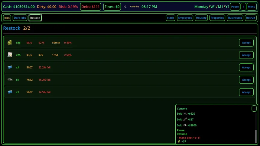"Build your empire from the streets. Manage employees, launder money, dodge raids and climb the criminal ladder — one deal at a time."