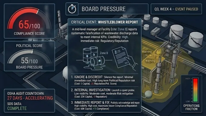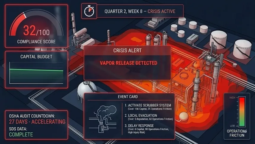 A corporate crisis management simulation where every decision has a cost, every audit has a deadline, and one wrong call can cost careers, compliance, and lives.