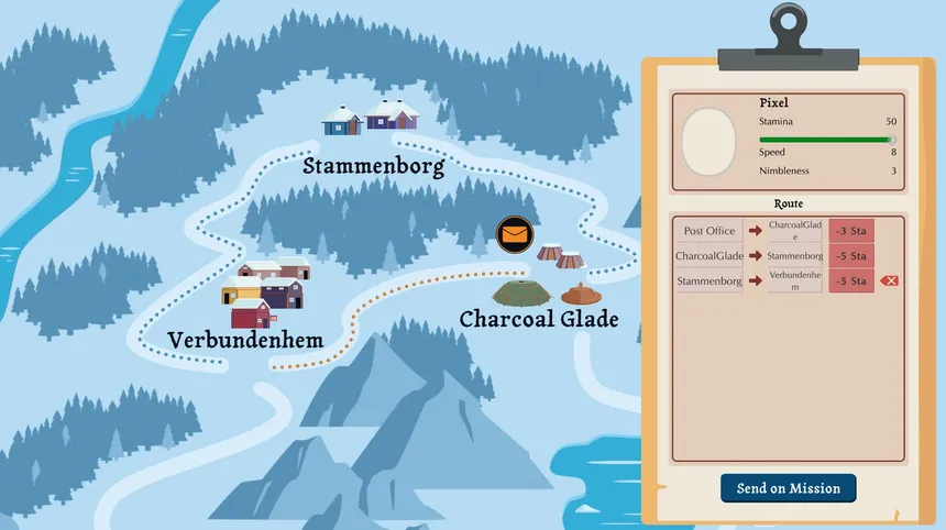 “Doggo Delivery Department” is a cozy management game about rebuilding a forgotten post office in a frozen world. Send your loyal dogs on delivery missions, reconnect distant villages, and restore warmth to the land and its people - one letter at a time.