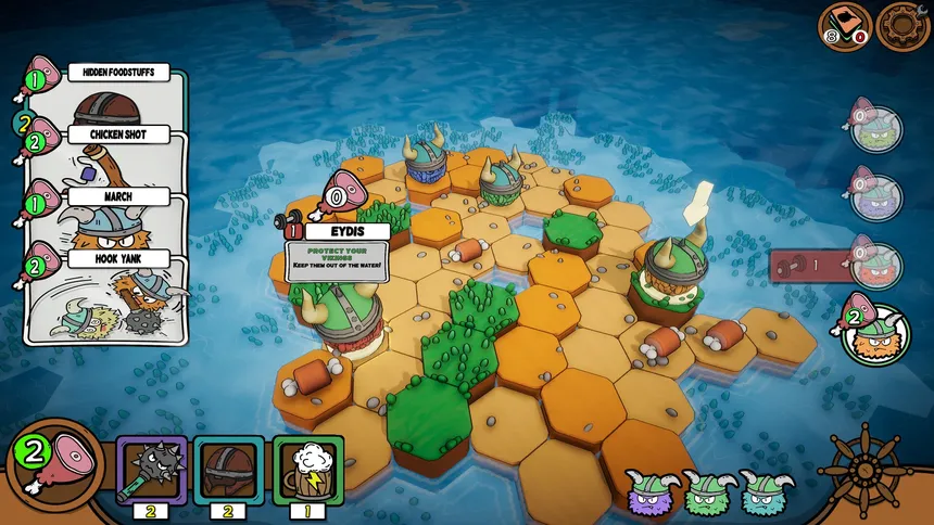In Viking Nudgers, your cards don’t deal damage. they push, pull, collide, and topple everything around you. The battlefields are islands of hex tiles suspended above the rough sea, and one wrong move could send you, or your enemies rolling off the edge like a marble!