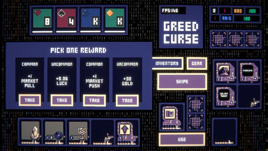 Greedcurse — игра от компании Unleash Studio, разработанная для платформы PC. Проект совмещает в себе такие жанры и элементы, как карточная. Дополнительно игроки выделяют такие особенности игры, как рогалик, упрощённый рогалик, карточная игра и построение колоды. Игра рассчитана на одиночное прохождение, многопользовательские режимы не предусмотрены.