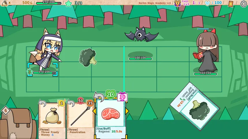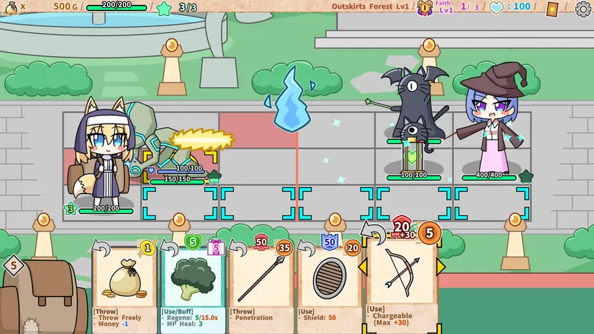 A mismatched duo—a wicked demon god and a kind-hearted fox girl—sets out to gather followers!? A card-collecting roguelike action game. Fight in real time on a 3×6 grid: use your cards or throw them as weapons, and adapt to every battle.
