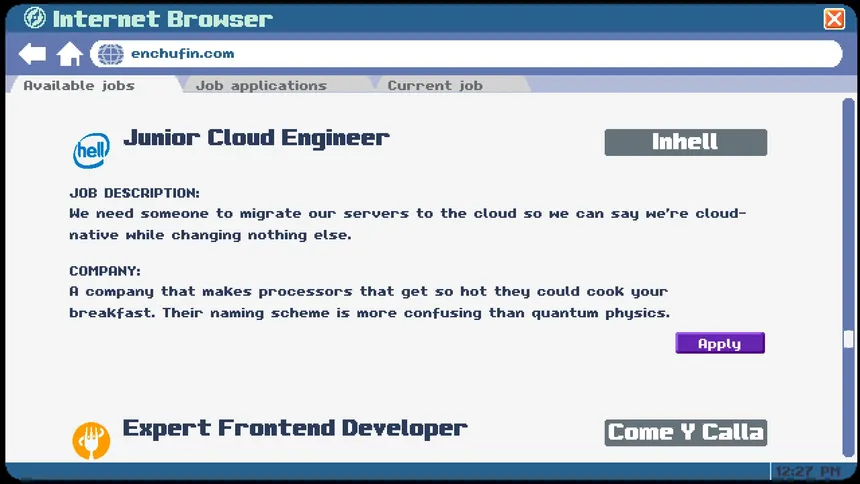 Play as an aspiring software developer in a world dominated by soul-sucking corporations. Will you achieve your goals and build a career in the software industry, or will burnout crush you first?