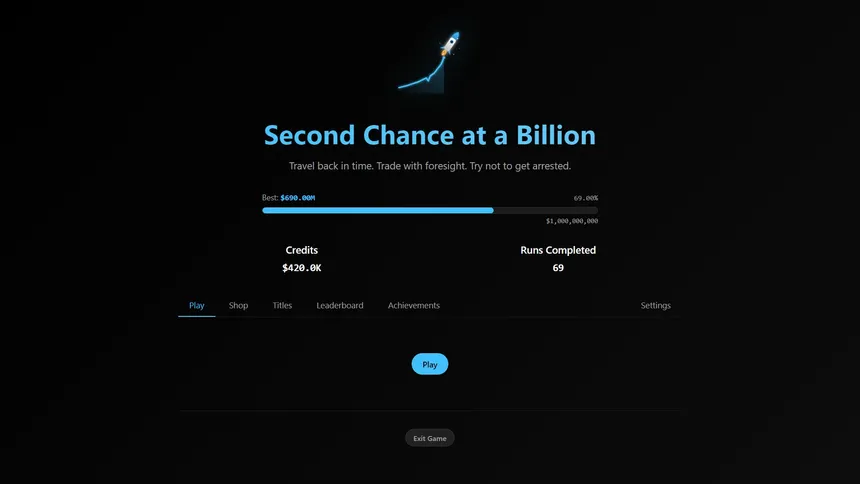 A dark comedy roguelike set in the real stock market. Travel back in time armed with 25 years of hindsight, trade real historical assets, dodge the SEC, and try to turn $10,000 into $1 billion before you get arrested or fired.