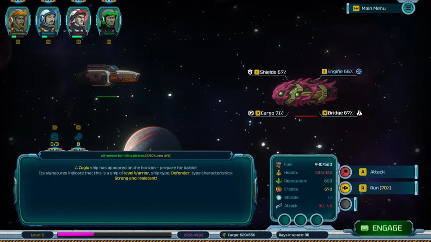 Отправляйтесь в научно-фантастический пошаговый RPG-рогалик. Станьте капитаном грузового корабля, доставляйте грузы, управляйте экипажем, улучшайте корабль, сражайтесь с космическими военными кораблями и стройте свою репутацию. Каждый день приносит новое приключение. Космос не знает пощады.