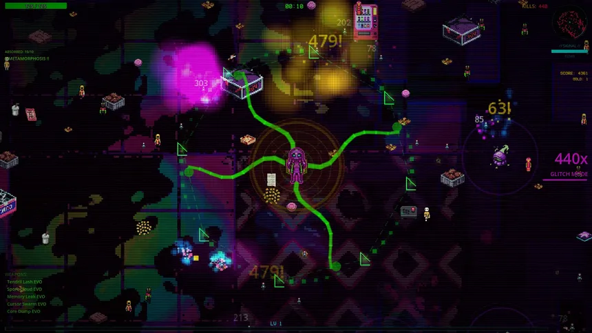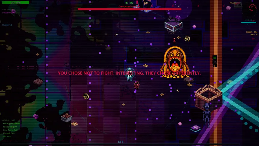 A cursed arcade cartridge. A bullet heaven that remembers. Fight through waves of glitched creatures, evolve 20 weapons, hunt ARPG loot, and try not to notice when the game starts watching you back. The deeper you go, the more the corruption spreads.